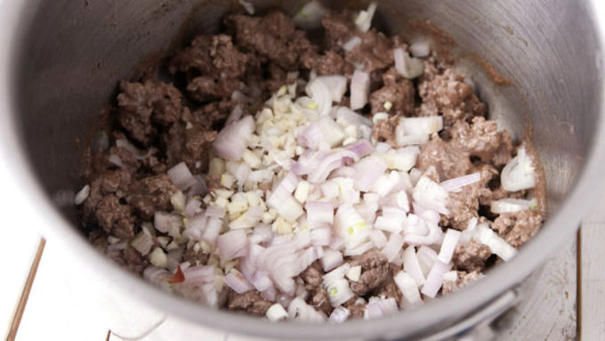 Step1In a large pot over medium high heat, add oil and let heat until shimmering. Then add ground sirloin and brown well. Cook for 6-7 minutes until meat is well browned.
