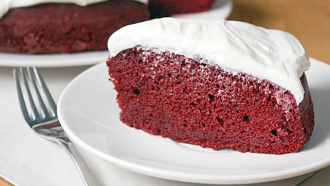 Boozy red velvet cake topped with cream cheese frosting.