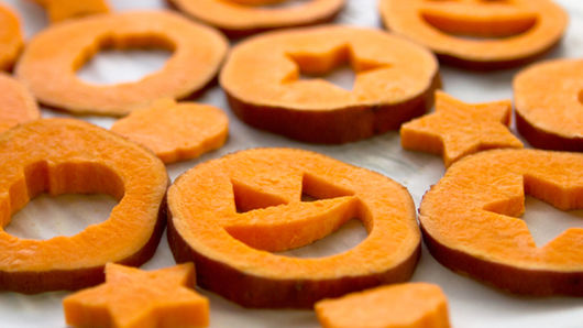 Use mini cookie cutters to cut jack-o-lantern faces, stars, and pumpkins into the center of each sweet potato slice. Or, use a small knife and carve a mini jack-o-lantern face into the sweet potato slices.
