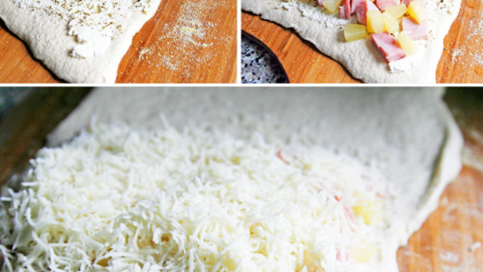 Step2On a cornmeal-sprinkled pizza peel (or other surface), roll out the pizza dough. Spread ricotta cheese over the dough surface, leaving a little room at the edge. Sprinkle with Italian seasoning. Spread the ham and pineapple over half of the dough and top that with shredded mozzarella cheese. Fold the dough over to form a pocket and press the edges to seal.