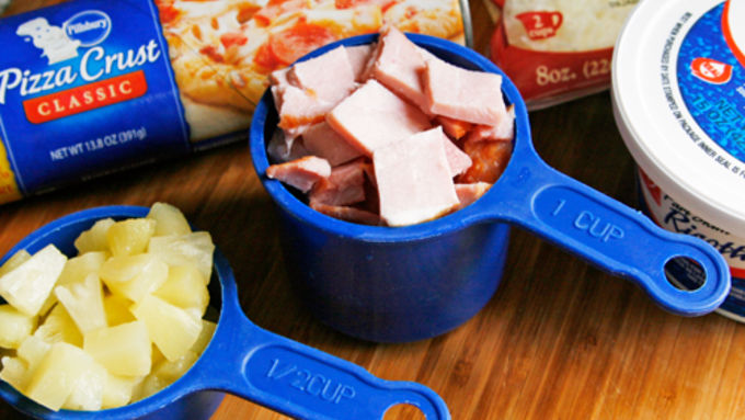 - Let your leftover Christmas ham escape to the tropics with this awesome calzone recipe! Baked spiral ham is a Christmas tradition for our family. Every year, I look forward to the sweet slices of brown sugar glazed ham – and, even more so, the leftovers. Leftover ham is perfect for omelets, frittatas, sandwiches, homemade pizza and so much more. It’s also awesome for an easy homemade Hawaiian Calzone. Now, don’t let the total time on this recipe fool you. It takes awhile because I like to make it on a pizza stone, which gives it an amazing, crunchy crust. Because pizza stones have to be heated for 30 minutes (don’t worry – you can totally do this while preheating the oven), it looks like this takes a long time to make. It totally doesn’t. The actual cooking time is 15-20 minutes. Add in the 10 minutes prep and 5 minutes rest time and you have a simple meal that repurposes leftovers in an ingenious new way in about 30 minutes. Easy peasy. You start with a few simple ingredients – a Pillsbury Pizza Crust, mozzarella cheese, ricotta cheese, Italian seasonings, ham and pineapple. Bake it up … and then before you know it, you have this amazing calzone –it serves four and is awesome with a big green salad.