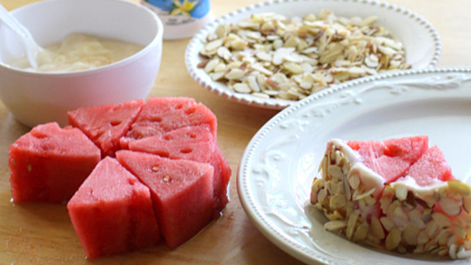 Step3Dip outside curved edge of watermelon in yogurt then in sliced almonds and place on serving platter in a pie-shaped formation. Repeat with remaining watermelon wedges.