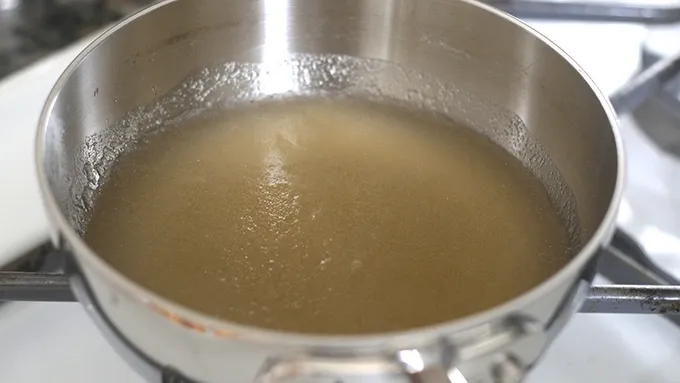 Step3When ready to make white layer, pour water into a small saucepan and sprinkle with gelatin. Allow to soak in a minute or two and then heat on medium, stirring constantly until gelatin dissolves. Remove from heat and pour into a heat-safe measuring cup. Add enough sweetened condensed milk to achieve approximately 1.5 cups of liquid. Stir to combine completely. Allow to cool for about 10 minutes. (Or it will melt the hearts.)