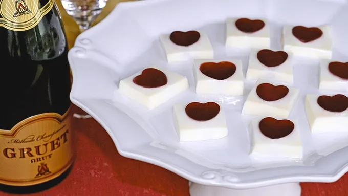 - Sweet little jelly shot heart boxes are a cute way to spread a little love. February 14th is rapidly approaching, and most people fall into one of two camps: 1) The “I’m in a relationship and get to spend this lovey-dovey holiday with my significant other” camp, or 2) the “I’m single and I hate Valentine’s Day” camp. (I fall into the latter this year.) But whichever you fall into, I’ve got the treat for you! Whether you’re creating a special evening for that special someone or drinking away your sorrows while catching a movie with your friends (yup, that’s me)… these adorable boozy bites inspired by The Hungry Housewife's Valentine's Day recipe are perfect for your day of hearts. To me, Valentine’s Day isn’t complete without some bubbly. (Come to think of it, most days aren’t complete without it, but that’s beside the point.) I also love the idea of cherry liquor to give the hearts a deep, rich flavor. (You could try a raspberry or strawberry liqueur if you prefer). The lemonade provides a nice base and adds a tartness to the shots. When ready to serve, carefully turn the pan out on a cutting board and, using a very sharp knife, cut into even squares. Arrange on a platter and serve! Who needs a box of conversation hearts when you have a box filled with a boozy heart? Cheers!