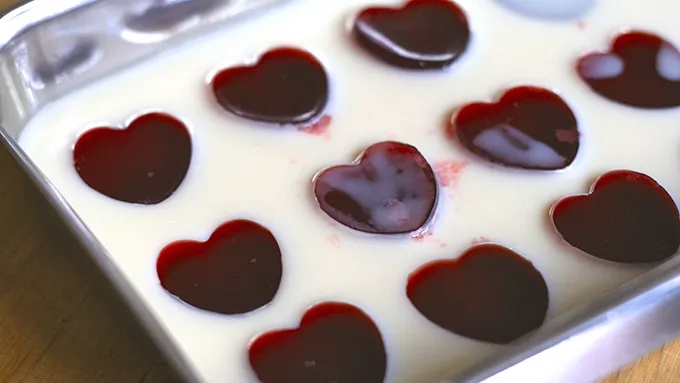 Step4Remove red mixture from fridge and using a small 1-inch heart-shaped cutter, cut into small shapes. Clean out pan and again spray with cooking spray and wipe with a paper towel. Arrange hearts in the tray in a straight line and equally spaced apart. Pour cooled white mixture around hearts. You may not need all of the white mixture. Fill until right below the level of the hearts. You don’t want to submerge them.