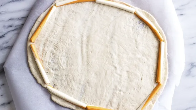 Step2Slice the cheese sticks in half lengthwise and place them around the edges of the pizza dough. Roll the edges up and over the cheese, pinching the dough to seal in the cheese.