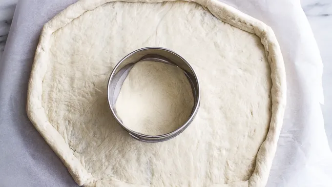 Step3Using a large 4-1/2 inch circle cookie cutter or a sharp knife, cut a circle out of the middle of the dough. Use the leftover dough to fill in any thin spots around the wreath.