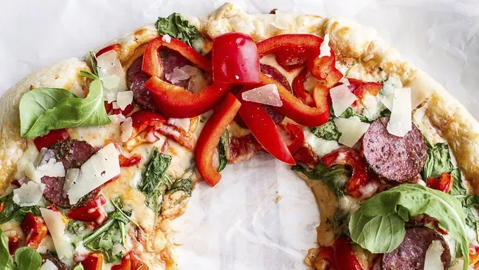 - An easy refrigerated crust is dressed with red and green fixin's. As you can see, I have fully immersed myself in the holiday sprit – and I couldn’t be happier about it. This is my favorite time of the year! All you scrooges out there should probably just look away now, because… it’s time to talk Christmas food. YES!! This is probably one of the most festive recipes I have, and wow, it’s so fun, so good and super easy to make. It's ridiculously perfect for all those holiday gatherings this time of year. PLUS, it doubles as a beautiful holiday centerpiece. I mean, how perfect is that? You can really flavor this pizza any way you like, as long as there’s plenty of red and green going on. I used pizza sauce, arugula and red and green peppers, but pesto, sun-dried tomatoes and spinach would be awesome as well. Garnish the pizza with fresh arugula and Parmesan cheese, and add a red bell pepper bow at the top. And that's how to dress a pizza for the holidays!