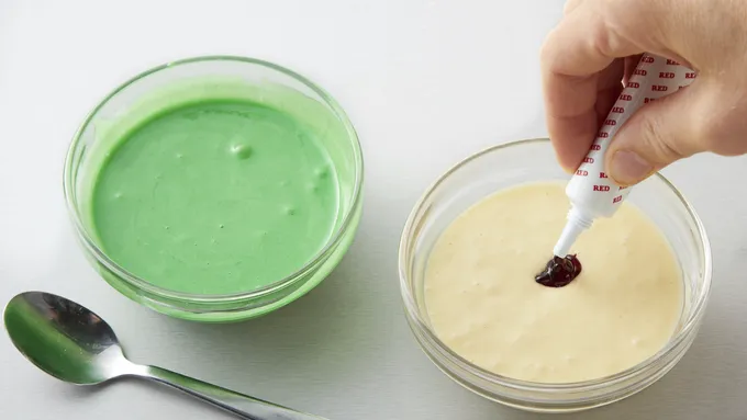 In large bowl, beat cake mix, water, oil and eggs with electric mixer on medium speed 2 minutes, scraping bowl occasionally. In small bowl, place 1/2 cup of the batter; stir in red food color until blended. In another small bowl, place 1/2 cup of the batter; stir in green food color until blended.