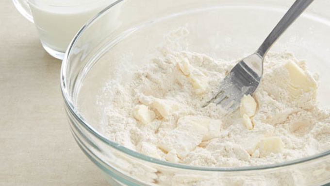 Step2In medium bowl, stir together 1 1/2 cups flour, 1/4 cup sugar, the baking powder, 1/2 teaspoon cinnamon and salt. Cut in butter, using pastry blender or fork, until mixture looks like coarse crumbs. Stir in milk just until combined; set aside.