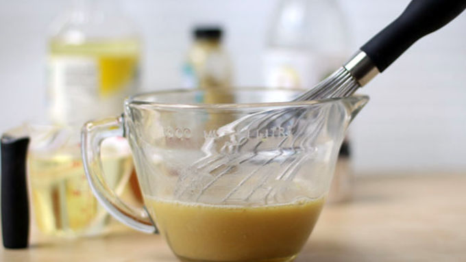 Step1In a large mixing bowl whisk together apple cider vinegar, honey, dry mustard and Dijon mustard. Slowly drizzle in oil, continuously whisking.