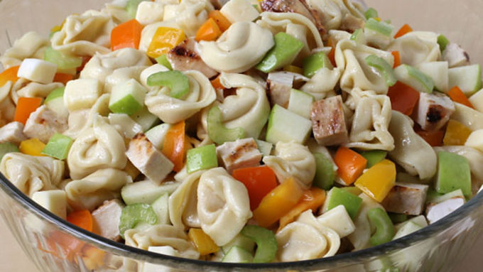 Cheese tortellini tossed together with tart apples, sweet bell peppers, crisp celery, grilled chicken, Havarti cheese and homemade honey mustard dressing.