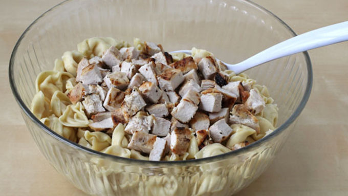 Step2Cook tortellini according to package instructions. Drain. Pour into a large serving bowl. Pour about 2/3 of the honey mustard dressing over the tortellini. Toss to coat. Add diced chicken. Allow to cool for 15 minutes, then refrigerate for at least 30 minutes.