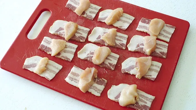 Step1Preheat oven to 350°F. Place a chicken cube in the center of each bacon strip, and wrap the bacon around the chicken. Secure with a wooden toothpick. Continue until all the chicken cubes are wrapped.