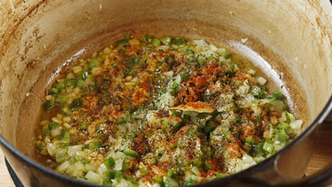 Step3In a large stock pot, add your oil over medium-high heat. Once hot, add the onions, celery, peppers, jalapenos, and garlic and cook until veggies are tender, a few minutes.