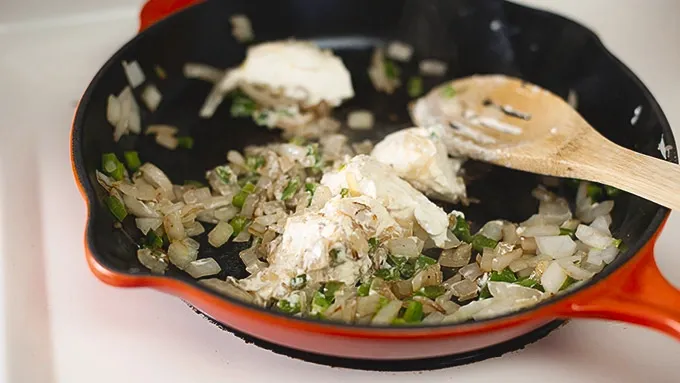 Step5Stir in the peppers and onions and cook for 3-4 minutes or until softened. Reduce the heat to low and add the cream cheese. Stir until it starts to soften and melt.