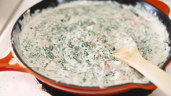 Step9Stir the spinach, pimentos, and salt into the melted cheese.