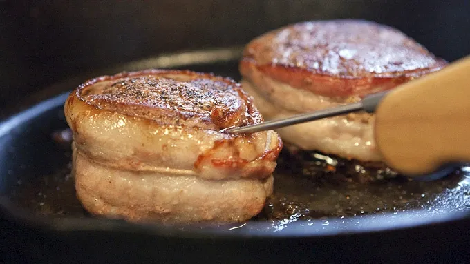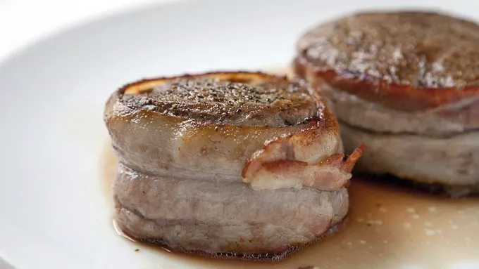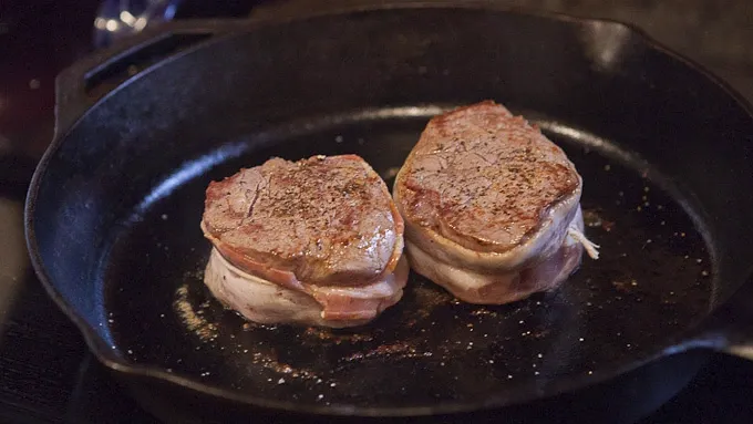 - Are you cooking to impress? Sure, you could spend lots of money going out to a fancy dinner, but I think it means so much more to cook a great meal yourself. It can be super impressive and also save you a good chunk of change. Even if you're cooking something like these filets, you’ll still save a boatload of money over what you would pay in a restaurant. And here’s a secret: They are really easy to cook. (I won’t even tell your date.) You can do this! There aren’t many ingredients needed to prepare a filet, so be sure to spend a bit more on high-quality ingredients, particularly the steak and bacon. You can use any bacon, although stay away from very thick-cut pieces, as they won't have time to cook through. Before you cook the filets, let them sit at room temperature for 30 minutes to slowly bring them up to the right temperature. Then wrap each filet in bacon and tie it with a piece of kitchen twine to hold everything in place. When you’re ready to start cooking, preheat your oven to 450°F. Place an oven-safe skillet on the stove over medium-high heat. When the pan is hot, add some butter, melt it and swirl it around the pan. Season the filets with salt and pepper and then sear each filet for about 90 seconds per side. Flip the filets to sear them well on both sides. Then transfer the whole skillet to the oven and let them finish cooking for about 5 minutes per side (10 minutes total). Be sure to turn them once halfway through. Assuming your steaks are about an inch thick, this should get you to about a medium-rare doneness. Here’s the most important part of this whole recipe: You absolutely need to use a meat thermometer on these. If you want medium rare, you want to stop cooking these guys when they hit 135°F. Even 10 degrees over and your steaks will be overcooked and start to get tough. Once the steaks reach the temperature you want, remove them from the skillet and cover them with foil. Let them rest for a few minutes and then serve them