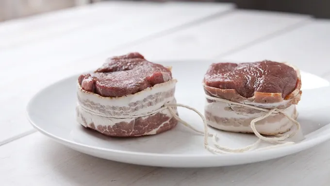 Step2Wrap edges of each steak with a strip of bacon and secure each with a length of kitchen twine.