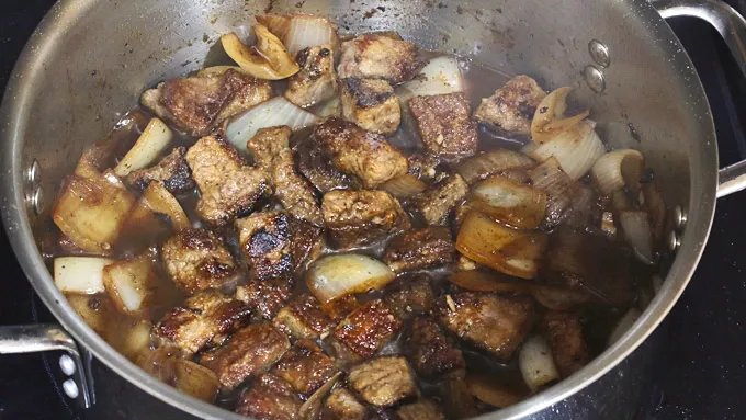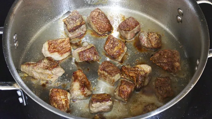 Step5Generously brown on all sides, working in batches until all the beef is browned. Transfer to a plate and set aside.
