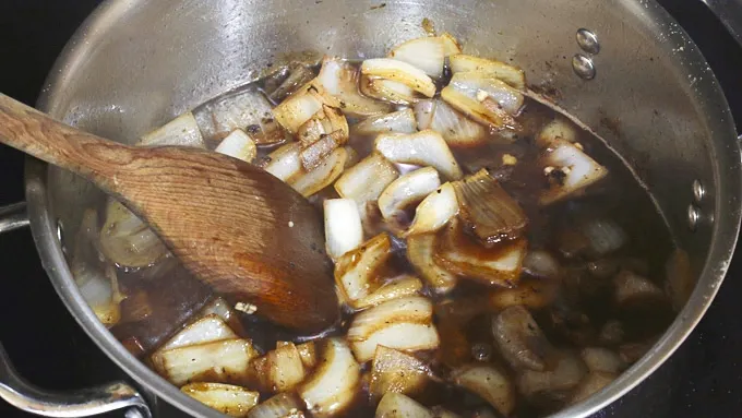 Step7Add the wine and bring to a rapid boil, scraping up the browned bits from the bottom of the pan.