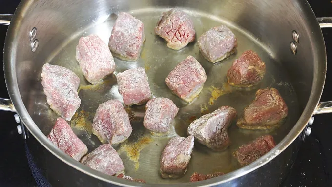 Step4Heat the oil in a heavy stockpot over medium-high heat until good and hot. Add the beef cubes, spacing them about an inch apart to ensure proper browning.