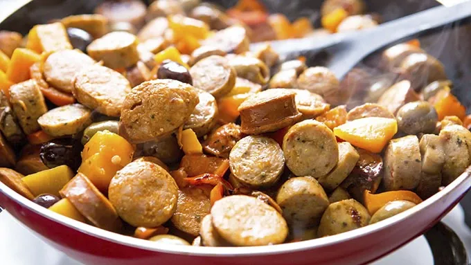 In a second large skillet, heat the remaining 1/4 cup olive oil over high heat. Toss in bell peppers, mushrooms, butternut squash, sausages and olives. Cook until the edges of the sausages turn golden brown and vegetables become tender (about 6-8 minutes).