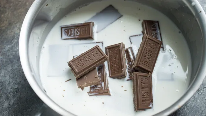 Step2Meanwhile, add milk and 7 oz Hershey’s® milk chocolate to a small pot and melt over low heat, stirring occasionally to prevent scalding. Do not simmer.