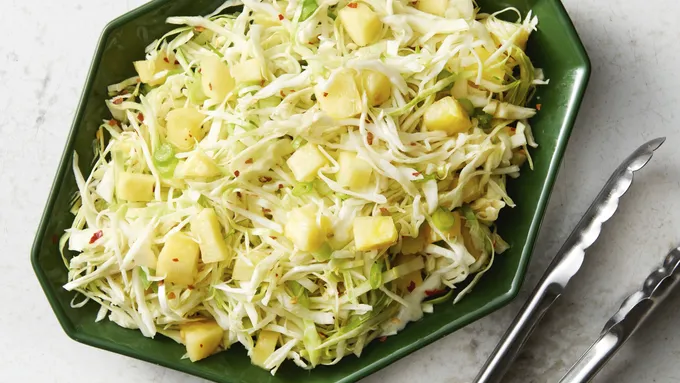 Step5Meanwhile, in medium bowl, toss cabbage, green onions, pineapple, lime juice, honey, oil, pepper flakes and remaining 1/4 teaspoon sea salt with tongs to completely combine.