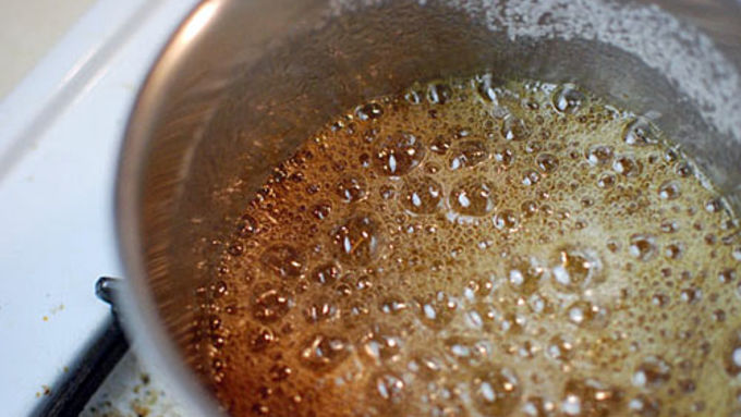 Step4Mix the water and sugar and put over high heat. Occasionally shake the pan around but don't stir. Cook about 15 minutes until browned but not burned. No stirring!