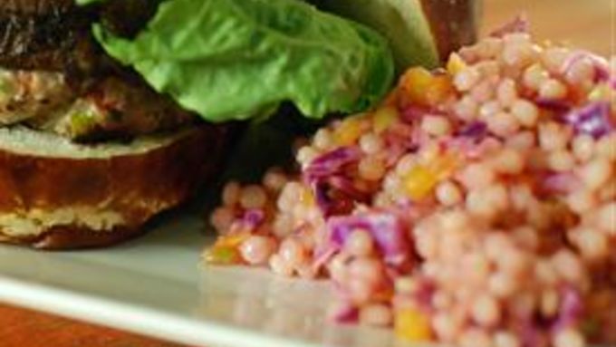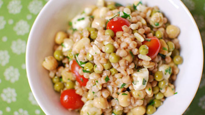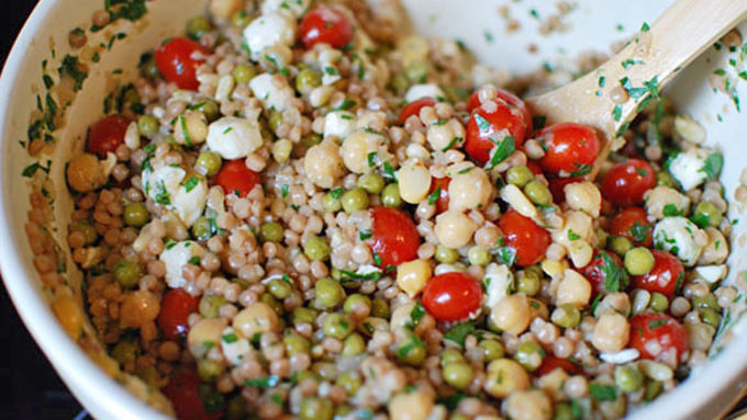 Step3Mix the couscous with the pea mixture. Add the lemon juice, pine nuts, strained/rinsed chickpeas, and tomatoes. Mix well. Allow to cool.