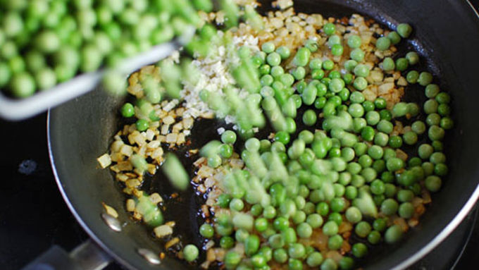 Step2Dice onion and garlic. Add the oil and onions to the frying pan and cook until onions are lightly browned. Add the garlic followed by the peas and cook 2 minutes while stirring. Add the vinegar to the pan and boil for 2 minutes. Remove from heat.