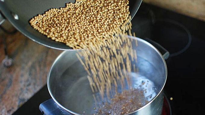 Step1Bring salted water to a boil. Toast raw couscous in a dry frying pan until browned. Pour into boiling water and cook like pasta until tender. Strain.