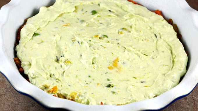 Step2Mix the sour cream, mayonnaise, and avocado together in a medium bowl. Mix until the avocado is smooth with very few chunks. Layer the avocado mixture on top of the chilies.