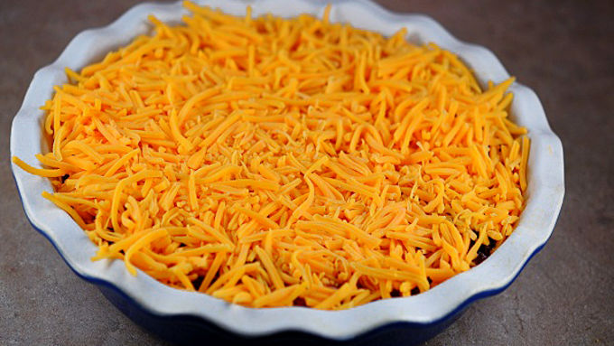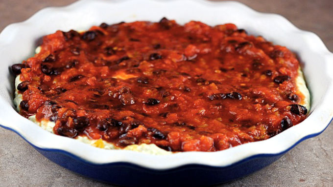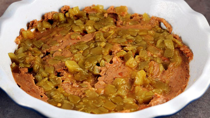 Step1Preheat oven to 350°F. In a greased deep pie dish, spread the refried beans and then layer on the green chilies.