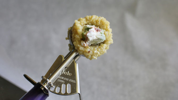 Step4Using a cookie scooper, scoop a small amount of quinoa into the scoop, creating a thin layer along the inside of the scooper. Using your finger, make a hole in the quinoa and place the hardened cream cheese mixture inside. Using a spoon, cover the mixture with a little more quinoa. Place the scoop onto a parchment-lined baking sheet. Repeat with the remaining mixture.