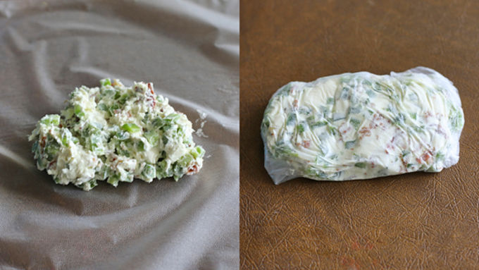 Step1In a small bowl combine the cream cheese, bacon and jalapeno. Place onto some plastic wrap and form a rectangle. Wrap mixture up and place in the freezer while preparing the rest. Preheat oven to 350°F.