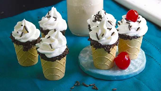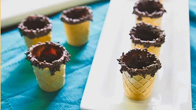 Step2Melt the chocolate chips and spoon equal amounts into the center of the cones, turning the cone as you go to completely coat the bottoms and insides. Turn the cones upside down and allow any extra chocolate to drizzle out. Dip the rim of each cone in the extra melted chocolate, then dip rims immediately in chocolate sprinkles. Set aside, right side up, and allow the chocolate to cool and harden (place in refrigerator to speed up this process).