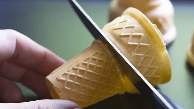 Step1If using standard-sized cake cones, use a very sharp knife to slice the large top from each cone, leaving just the smaller portion of the cone. (Mini cones won’t need this step.)