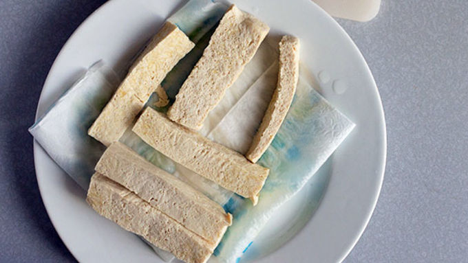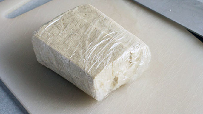 Step1Drain the tofu and place on cutting board. Cut in half like you would a bagel, then into 3 strips, keeping the tofu in the same block shape you got it in. Wrap tightly in plastic wrap and freeze for a minimum of 2 hours (or a maximum of one month if preparing in advance or storing for later).