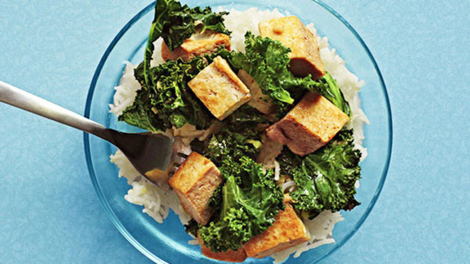 Say goodbye to soft tofu and say hello to crispy fried perfection, served up with tender kale on a bed of fluffy rice.