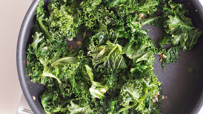 Step4Once tofu is done, place on a paper towel lined plate and add a tablespoon more oil in the pan. Sauté the garlic and red pepper flakes for a couple minutes until nice and fragrant. Add chopped kale and cook for 3-5 min until kale is wilted and cooked down a little.