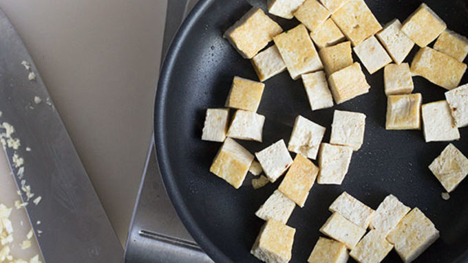 Step3When tofu is cool enough to handle, cut into cubes. Heat up enough vegetable oil to coat the bottom of a frying pan and place tofu cubes in the hot oil. Fry on each side until pieces are golden brown and crispy. (Now would be a good time to prep the garlic and kale)