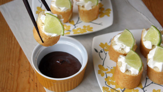 Step9Remove set cakes from refrigerator and from plastic wrap. Using a serrated knife, cut each cake into 1-inch pieces, like sushi (about 12 slices per cake). Turn cut-side down and top with a dollop of whipped cream and lime slice. Serve with warm chocolate sauce for dipping, if desired.