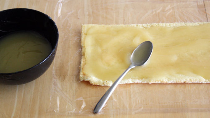Step8When cakes are cool, unroll from the towel and place each cake on a large sheet of plastic wrap. Spread half the filling on top of each cake (you might not use all the filling -- this is OK) and roll up tightly. Cover both cakes with plastic wrap and place in the refrigerator to set for 4 hours or overnight.