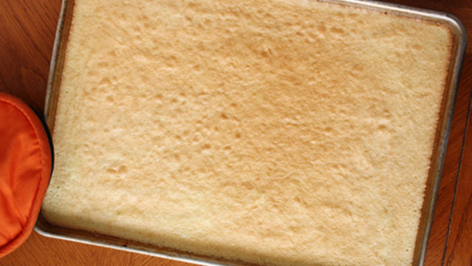 Step5Pour batter into prepared cookie sheet and spread evenly with a spatula. Bake about 10 minutes or until cake springs back when lightly touched.