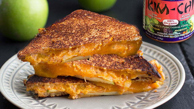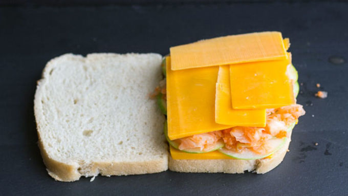 Step1Heat a large skillet over medium-high heat. Spread butter evenly on both sides of two slices of bread. Add one slice cheddar cheese, a few green apple (or Asian pear) slices, kimchi and one more slice of cheese evenly on one piece of bread. Top with the other slice of bread.