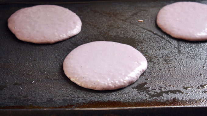 Step3Lightly grease a large skillet or griddle over medium-high heat. Pour slightly less than 1/4 cupfuls of batter (with a clean spoon or ladle for each bowl to avoid color contamination) onto skillet and cook until edges are dry and bubbles begin to form on the surface.