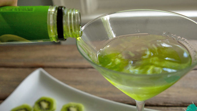 Step3Carefully drizzle the melon schnapps down the edge of each martini glass. The schnapps has a higher sugar content that the watered down vodka, so will naturally ease into the bottom of the glass if poured slowly and carefully.