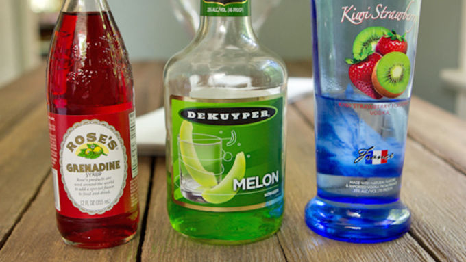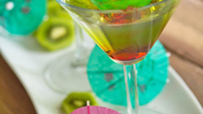 Get in on the layered cocktail trend with this surprisingly easy three-color cocktail in le flavors of strawberry-kiwi and watermelon.
